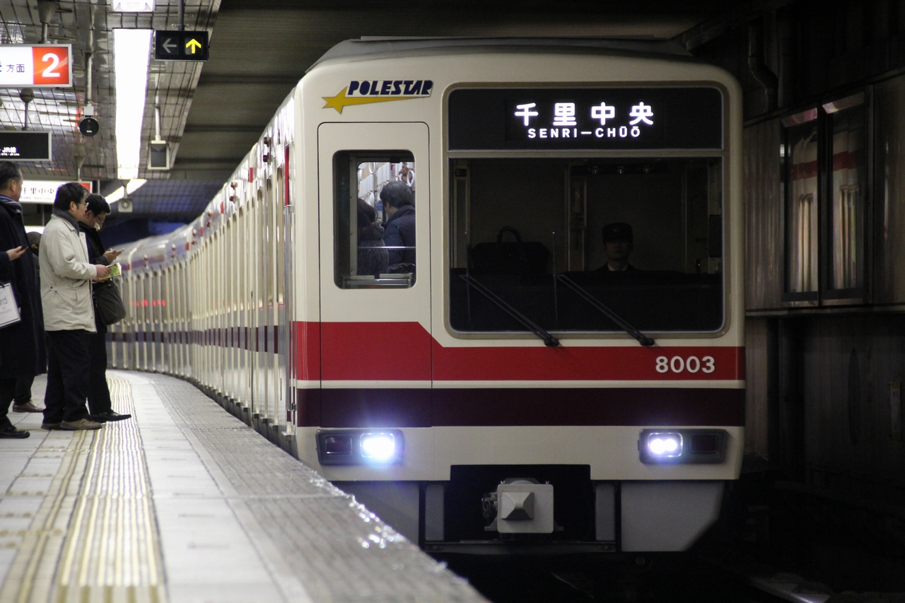 北大阪急行電鉄8000形車両は、1986(昭和51)年7月1日から営業運転を開始した車両で、開業当初からの2000形置き換え用に製造された。北の空に光を放ちながら方位の指針となっている北極星になぞられて「ポールスター(POLESTAR)」という愛称がついている。地下鉄車両として必要な仕様を十分具備しながら、車体の軽量化、保守用のモニタリングシステムの本格導入や、乗客に対する客室内設備にも細かい配慮を各所に払うなど、充実した内容を数多くもっていることが高く評価され、1987(昭和62)年にローレル賞を受賞した。また、1988(昭和63)年10月には「ポールスター号賛歌」が制作されている。