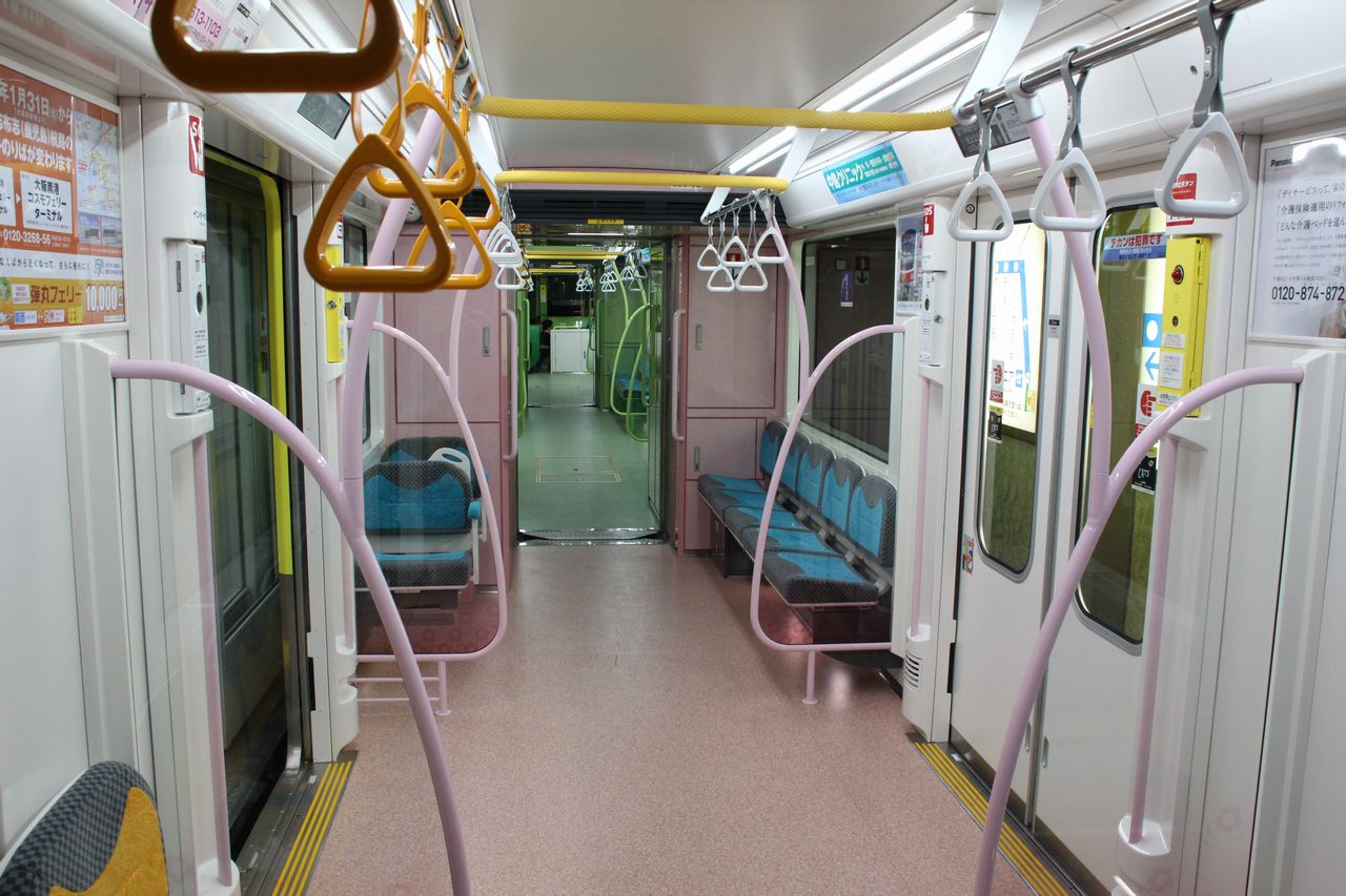 車内は、「南港に住んでみたい」「南港に行ってみたい」と思えるようなデザインとし、住之江公園方2両(1・2号車)は南港ポートタウンの公園の草木を、コスモスクエア方2両(3・4号車)は南港ポートタウンに咲く桜をイメージした配色となっている。座席は1人あたりの幅が従来よりも広くなり、一部をクロスシートとすることで通路・貫通路の幅を広く確保した。運転台部分も2人分の座席として開放されており、無人運転時は前面展望が楽しめるようになっている。優先座席は2・3号車に、車椅子スペースは1・4号車に設けられている。各扉上にはLCD式車内案内表示装置を設置、各車両妻面に1台ずつ沿線地域の楽しい情報などを提供する情報発信表示装置を設置している。照明はLEDを採用、省エネ化を図るとともに間接照明とすることでふんわり・やわらかい空間を演出し、足元灯・貫通路灯を追加してさらに明るい空間を創り出している。足元灯は第07編成以前と第08編成以降で取付方法が異なっていた。第07編成以前は横向き、第08編成以降は下向きとしていたが、後に下向きに統一された。またゴールド(稲穂)編成の第14編成の車内には68個の稲穂のイラストが点在している。