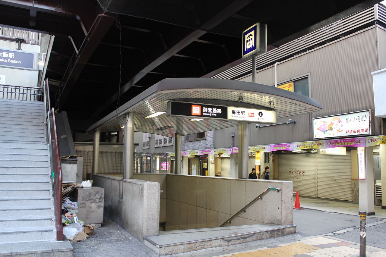 大阪市営地下鉄の初開業区間の駅。国鉄大阪駅の高架化や用地買収の遅れから仮駅での開業となり、仮駅は現在の新阪急ビル付近に設けられた。1935(昭和10)年10月6日に南半分が完成し本駅として使用開始されている。1937(昭和12)年4月には北半分が完成し、難波駅南側にあった新川出張所を梅田駅北側に移転させて梅田出張所を開設、その後淀屋橋出張所と統合し梅田検車場となり車両の検修を行っていた。1950(昭和25)年5月8日の阿倍野検車場開設に伴い、梅田検車場は廃止されている。当初の計画では、阪急前交差点付近で谷町線と合流し、大国町駅のような方向別の2面4線島式ホームとする計画だったが、後に建設工事が比較的容易となる路線別の2面4線島式ホームに変更された。この付近の地盤は軟弱で、建設工事中に2度の事故が発生したため、東側の隧道に関しては完成した一部を除いて建設工事を中止した。1961(昭和36)年に谷町線のルートが変更され、谷町線用とされた東側の隧道は使用されなくなった。高度経済成長期には輸送人員が急増し、ラッシュ時には入場制限が行われるなど、9.1mのホームは大変危険な状態が続いていたが、御堂筋線輸送力増強工事に伴い、一部が完成し放置状態であった東側の隧道を活用してホームを拡張することになり、幅12mの新下りホームが1989(平成元)年11月5日に使用開始、従来ホーム側も旧下り線を撤去して12mの上り線ホームとなった。江坂方には片渡り線が設けられているが、普段は使用されない。かつては早朝に梅田始発千里中央行きが設定されていたが、2006(平成18)年3月18日のダイヤ改正で天王寺始発に変更されたために消滅、またかつて深夜に梅田止が設定されていたが、2013(平成25)年3月23日のダイヤ改正で消滅している。2本あった梅田止まりの列車は到着後、中津・新大阪まで回送され夜間滞泊が行われていた。