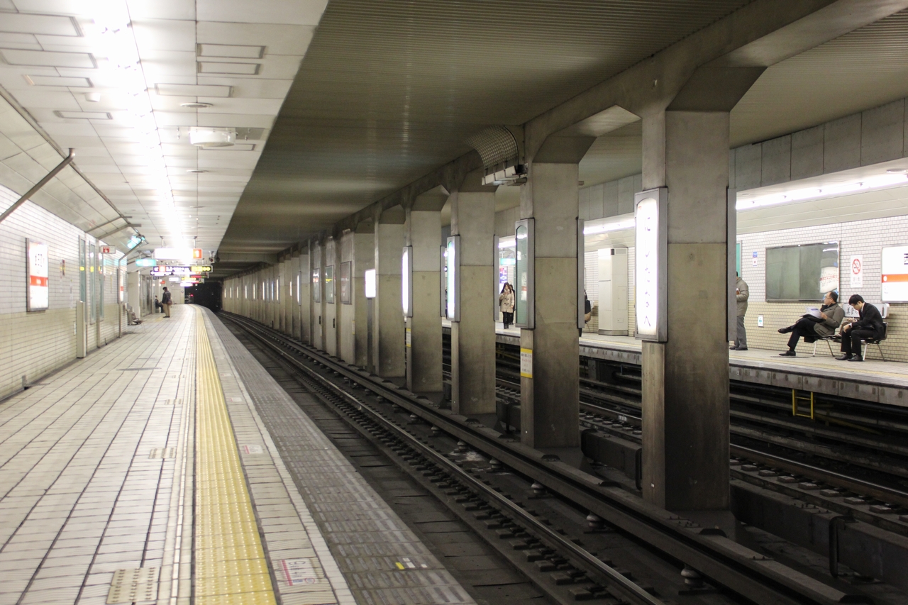 開業時は北半分のみで、南半分は長居検車場と同時に施工された。この駅は土被り約1.6mの浅い駅となっており、土荷重が少ないため、ホームは柱を無くしている。江坂方に片渡り線が設けられているが、普段は使用されない。 |