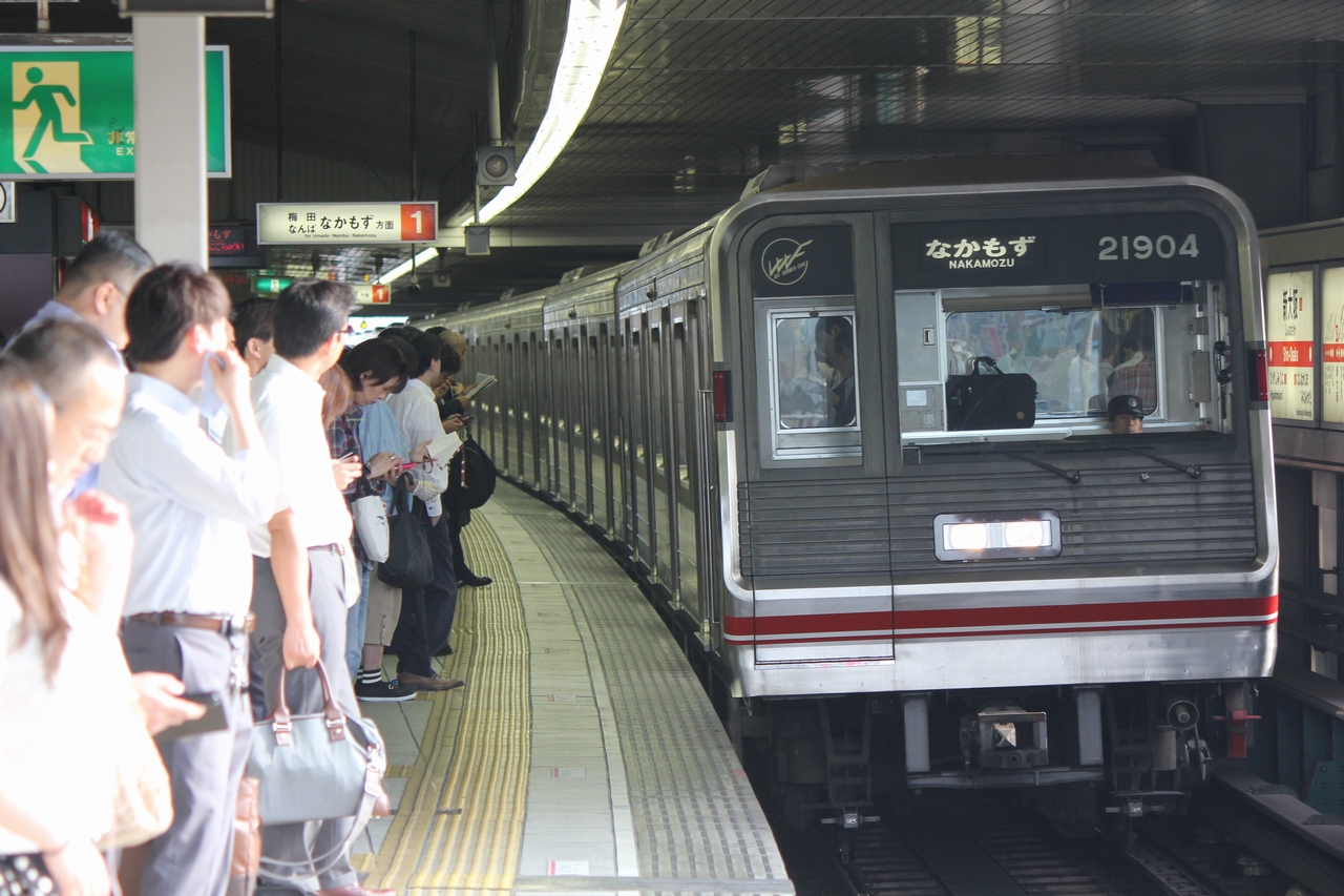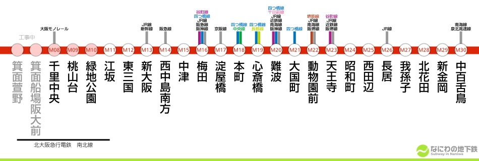 ●2018(平成30)年03月24日改正 2018(平成30)年3月24日改正ダイヤでは、朝混雑時運転間隔見直しに伴い改正が行われた。朝混雑時の上りで、最短2分15秒〜2分30秒間隔とばらつきがあったが、2分15秒間隔に変更することで増発を行った。また深夜帯の中津行きを新大阪行きに変更し、新幹線利用客の利便性向上を図った。前ダイヤと比べると、下りでは中津始発我孫子行きが消滅、上りでは新金岡始発発千里中央行きが消滅、土休日ダイヤの夕方にあった天王寺始発千里中央行きが消滅となった。また我孫子始発中津行きは復活している。