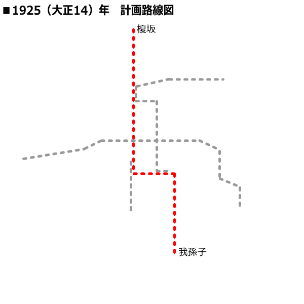 大阪市高速度交通機関協議会で1925(大正14)年10月に高速鉄道計画を策定、1926(大正15)年3月27日の市議会で都市計画決定された当初の計画では、1号線(御堂筋線)は「豊能郡豊津村榎坂〜東淀川区北川口町〜国有鉄道東海道線大阪駅〜都市計画路線御堂筋〜南海難波駅西端〜都市計画路線難波住吉線〜浪速区市電大国町交差点〜国有鉄道関西線天王寺駅南側〜住吉区西田辺町〜住吉区我孫子町」の、全長19.96kmの路線として計画された。この当時の計画では、榎坂から新淀川南側まで・天王寺から我孫子までは高架での計画であった。この中でも南方〜我孫子間は第1期事業、榎坂〜南方間は第2期事業とされた。1930(昭和5)年1月29日に御堂筋平野町において盛大な起工式を挙行し、梅田〜心斎橋間の建設に着手。梅田・淀屋橋付近の軟弱地盤に悩まされたり、日本初の河底隧道などの難工事を乗り越え、日本初の公営地下鉄として1933(昭和8)年5月20日に梅田(仮駅)〜心斎橋間を開業した。梅田駅は国鉄高架工事や用地買収の遅れのために仮駅として開業、後の1935(昭和10)年10月6日に本駅が使用開始された。初開業区間は雄大な構想に基づいて建設され、梅田・淀屋橋・心斎橋の3駅は天井が高いドーム形状、ホーム延長は最大12両と設計されていた(後に10両対応に計画変更)。初開業に先立つ1933(昭和08)年4月には心斎橋〜難波間の建設に着手。1935(昭和10)年10月30日に心斎橋〜難波間が開業し、“キタ”と“ミナミ”が直結され、地下鉄としての機能を十分に発揮するようになった。難波から南の区間は、道路拡張に伴う用地買収の遅れ・地下埋設物の処理に時間を要し、さらに資金調達が思うようにいかずに遅れていたが、1933(昭和8)年6月に難波〜天王寺間の建設に着手。1938(昭和13)年4月21日に難波〜天王寺間が開業し、梅田・難波・天王寺の各ターミナルを結び、後に大阪の大動脈となる1号線(御堂筋線)の基礎が完成した。その後も第1期事業完遂のため、1938(昭和13)年11月に天王寺〜西田辺間の建設に着手。しかし日中戦争が拡大、建設資材が軍需資材として統制されるなどし、1941(昭和16)年には太平洋戦争が勃発。1943(昭和18)年3月、天王寺駅南約600mの隧道を造ったところで建設中止となった。 |