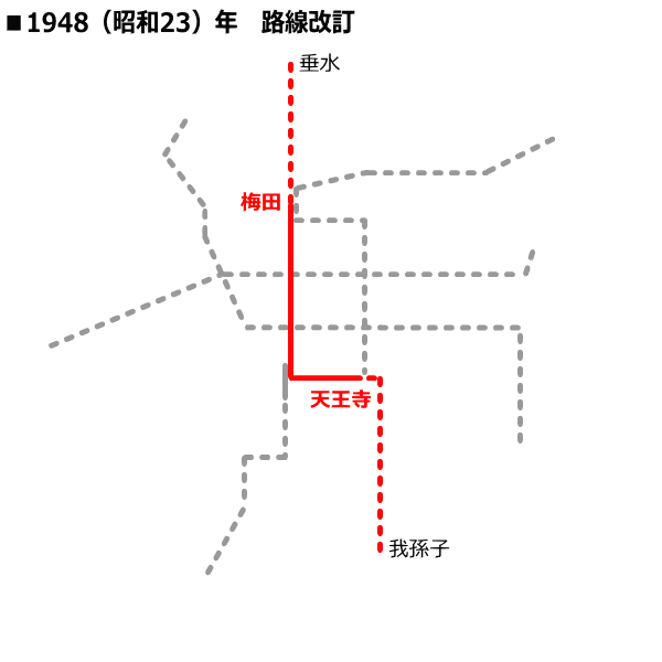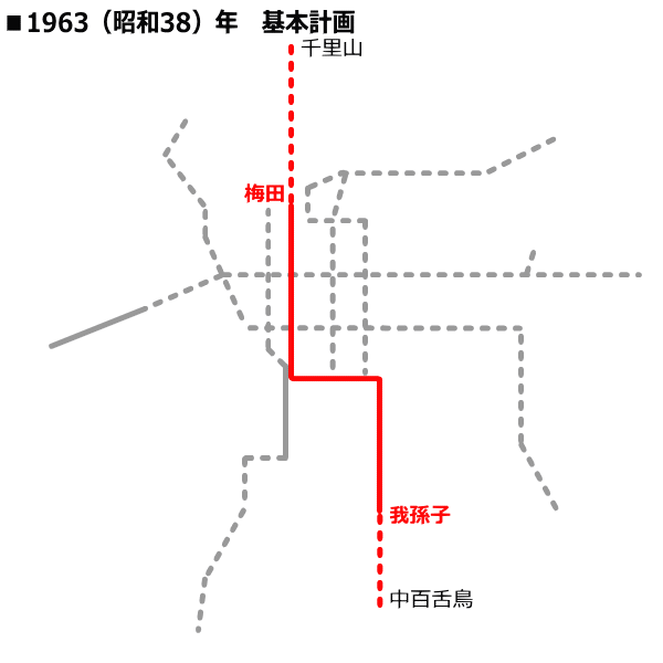 1948(昭和23)年6月18日に市議会で確定した路線改訂では、南北の交通量が多い大阪の大動脈であった営業区間の7.5kmと特許区間をそのまま採用。北部については将来の情勢によっては豊中市蛍ヶ池方面へ延長することを考慮して計画され、区間は「吹田市大字垂水〜住吉区我孫子町」で19.90kmの路線となったが、大きな経路変更は行われなかった。1950(昭和25)年6月17日に中止されていた天王寺〜西田辺間の建設が再開された。この建設中止により、長期間にわたって御堂筋線を中心に発展、御堂筋線が主体の大阪圏交通事情が形作られた。1951(昭和26)年12月20日に天王寺〜昭和町間、1952(昭和27)年10月5日に昭和町〜西田辺間が開業した。 1958(昭和33)年3月28日の都市交通審議会答申第3号「大阪市およびその周辺における都市交通について」では、1号線の垂水〜南方・西田辺〜我孫子が特に力を注ぐべき路線、垂水〜千里山付近・我孫子〜堺市東部が今後の情勢の変化に対応し、慎重な考慮が必要とされた。 車庫用地として住吉区我孫子町に戦前土地を取得していたが、一挙に路線を延長して車庫を建設するには当時の財政事情からみて困難であったため、一時的な措置として住吉区西長居町に6両編成対応の検車場を建設して使用していた。しかし年々増加していく輸送需要に対応ために7両編成以上が収容できる車庫建設が急務となり、1958(昭和33)年6月30日に西田辺〜我孫子間の建設に着手。1960(昭和35)年7月1日に西田辺〜我孫子間が開業し、直後に我孫子検車場の使用が開始された。 |