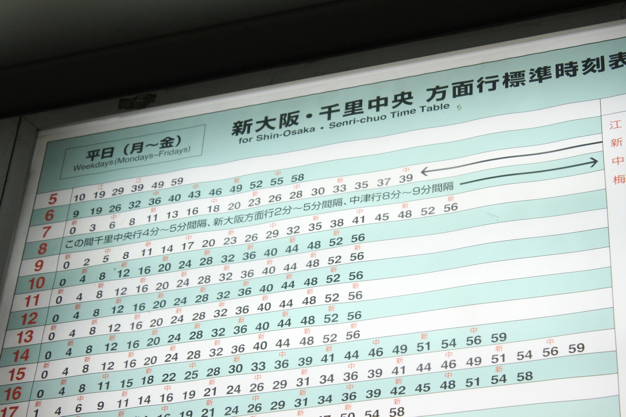 ●平日朝混雑時の時刻表 御堂筋線の時刻表で目を引く箇所といえば、平日朝混雑時の7時台・8時台の時間帯で、詳細の時刻は表示いないのが特徴である。ポケット時刻表もこの方式であったが、平成初期に全時刻が掲載されたものに変更された。駅の時刻表は2011(平成23)年頃より全時刻が表示されているものが登場し、この方式のものも数は減らしているが現在も存在する。 |