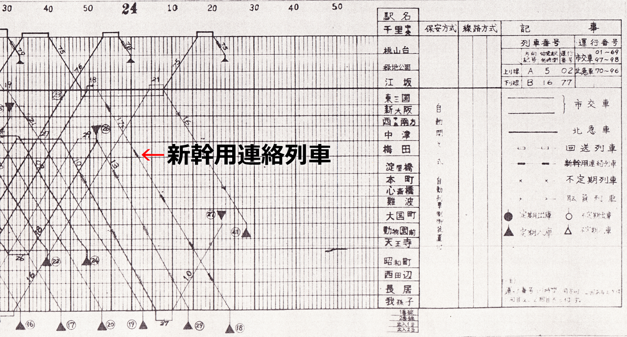 ●“時刻表に載っていない”最終電車 かつて御堂筋線には、時刻表に載っていない最終電車が存在した。その名は「新幹用連絡列車」、現在のなかもず行き最終にあたる。この列車に関する資料があまり残っておらず、運行開始時期などは不明。巷では幻の最終電車・幽霊列車などと呼ばれていた。当時の新幹線最終電車で新大阪に到着しても地下鉄の運行は終了していた。それに対応すべく生まれたのが新幹用連絡列車であり、乗車は新大阪駅のみ、西中島南方から先は降車のみで、回送列車扱いとして運行していた。回送列車扱いであったために時刻表には掲載されておらず、幻の最終列車となっていた。1989(平成元)年頃に旅客列車へ変更になったとみられるが、正確な情報は不明。右の画像は、1975(昭和50)年03月30日改正の列車運行図表。赤色矢印で示している運番17の列車が新幹用連絡列車で、江坂23:52発、新大阪23:56発、我孫子0:24着となっている。 |