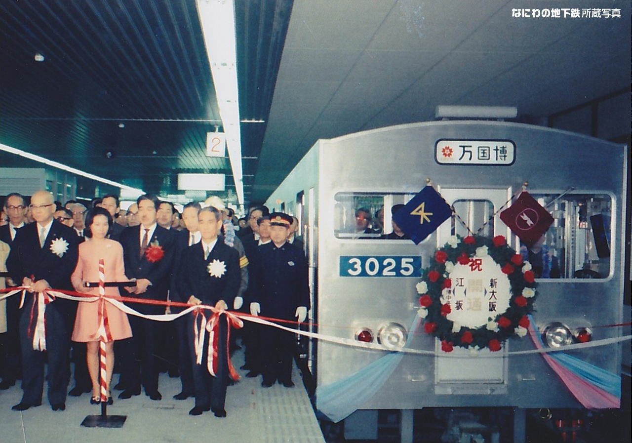 1963(昭和38)年3月29日の都市交通審議会答申第7号「大阪市およびその周辺における高速鉄道の整備増強に関する基本計画について」を受けて改訂された基本計画では、御堂筋線は北側の終点を垂水から千里山に変更、南側も中百舌鳥への延長が盛り込まれた。またこの答申に別紙で「大阪市高速鉄道第1号線の輸送限界に対処する方策について」と題する中間決定事項が添付されるほどの混雑度で、1961(昭和36)年には、1958(昭和33)年の都市交通審議会答申第3号で想定した1975(昭和50)年度の輸送量をすでに達成し、7両編成2分30秒間隔でピーク時の最大混雑率は300%と非常に深刻な状況であった。東京オリンピックを機に建設される東海道新幹線と接続するため、淀川区宮原町まで延長されることとなり、1962(昭和37)年10月に新大阪〜梅田間の建設に着手。1964(昭和39)9月24日に新幹線の開通に先立って新大阪〜梅田間が開業した。また1965(昭和40)年9月には、万国博覧会が大阪府吹田市の千里丘陵での開催が決定。大阪府が造成している千里ニュータウンの通勤通学の足を確保するために御堂筋線をさらに北進させることになった。大阪府は阪急電鉄へ建設要請を出したり、大阪市による延伸要請も行っていた。大阪市・阪急電鉄ともに消極的で、大阪市としては市費を市域外に使う事に関しての合意や、御堂筋線の延伸に対する財政支援を大阪府が拒んだために大阪市は断念。万博輸送は江坂からバスという案まで浮上した。結局江坂までは大阪市、江坂以北は北大阪急行電鉄が建設・運営し、1号線と相互直通運転を行うことになった。1968(昭和43)年1月4日に江坂〜新大阪間の建設に着手し、1970(昭和45)年2月24日に開業、相互直通運転を開始した。 1971(昭和46)12月8日の都市交通審議会答申第13号「大阪圏における高速鉄道を中心とする交通網整備増強に関する基本的計画について」では、御堂筋線の輸送力を緊急に最大限まで行うとともに、新規の輸送施設の開発・実用化を早急に実現するように提言された。また、我孫子〜中百舌鳥間が削除され、新たに堺筋線が動物園前から天下茶屋を経由して中百舌鳥まで延伸させる構想が追加された。 |