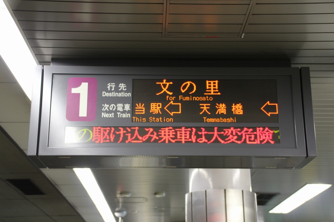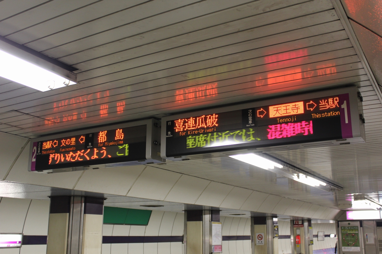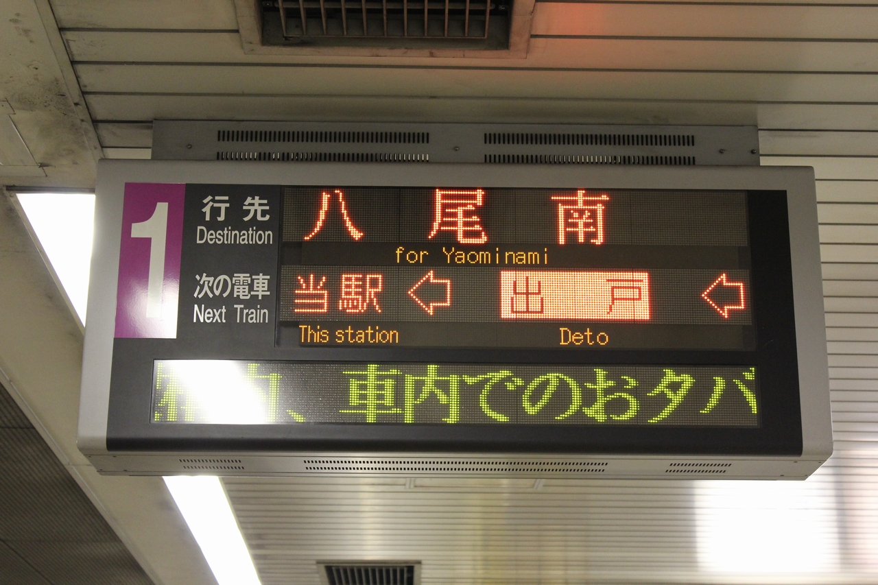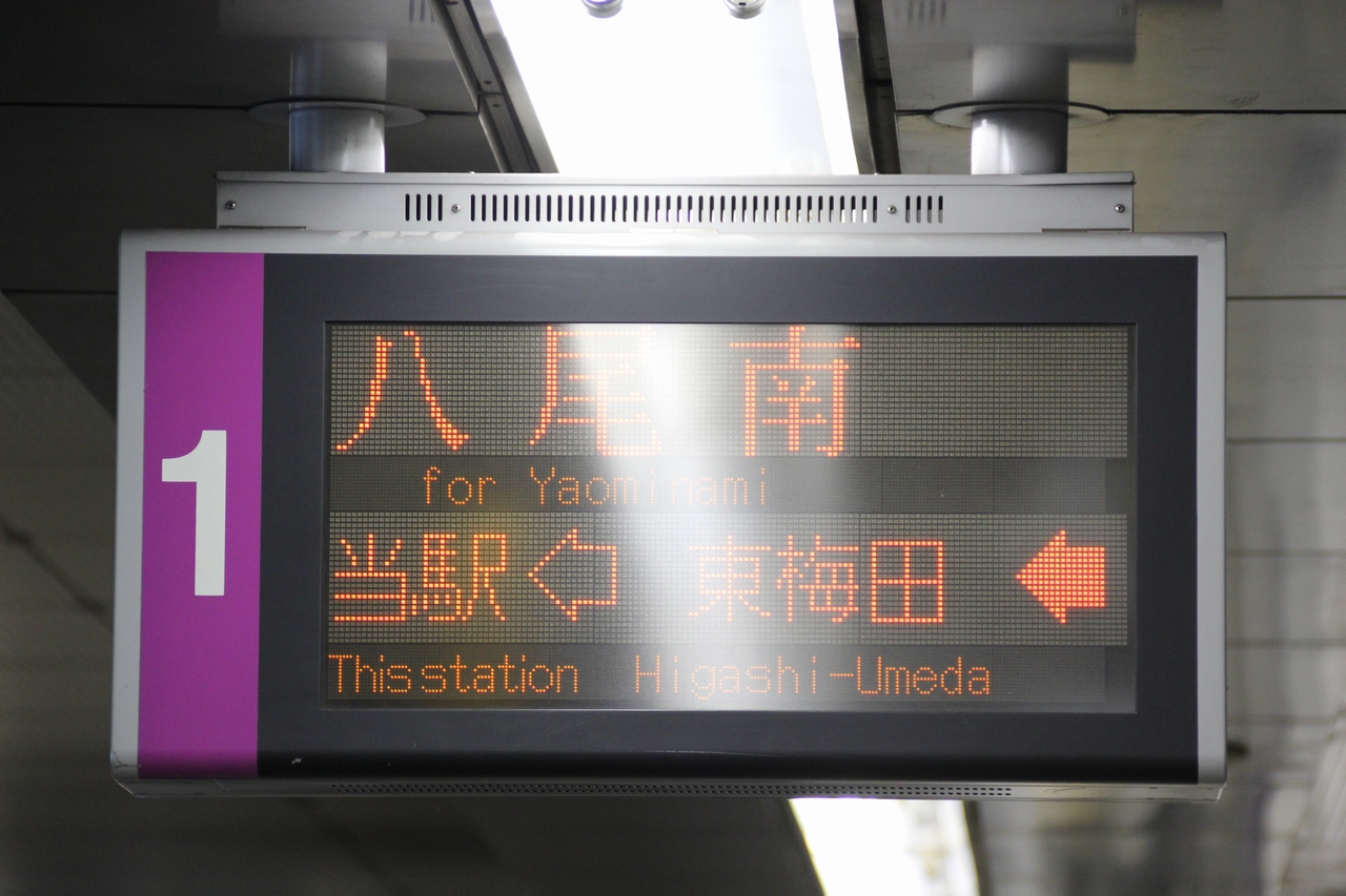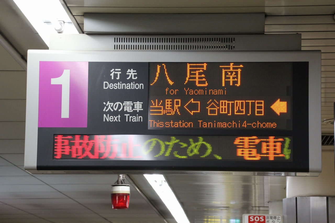 現在の旅客案内表示装置は3色LED式で、日本語・英語の2か国語に対応している。2001(平成13)年頃に、行灯式から更新された。谷町四丁目駅のみ先行して更新が行われたため、初期の大型の装置となっている。その他、標準型(番線表記半角、全角)や小型、阿倍野型が存在している。【標準型(番線表記半角)】 大日、守口、関目高殿、野江内代、都島、天神橋筋六丁目、東梅田、南森町、天満橋、谷町九丁目、四天王寺前夕陽ヶ丘、天王寺、文の里、田辺、駒川中野、喜連瓜破、出戸、長原、八尾南 【標準型(番線表記全角)】 太子橋今市、千林大宮、中崎町、谷町六丁目、平野 【大型】 谷町四丁目 【小型】 南森町、阿倍野 【阿倍野型】 阿倍野 |