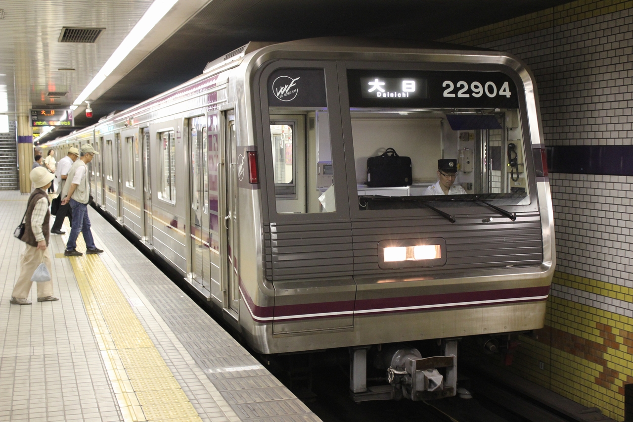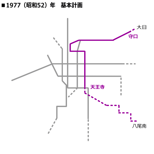 1963(昭和38)年3月29日の都市交通審議会答申第7号「大阪市およびその周辺における高速鉄道の整備増強に関する基本計画について」を受けて改訂された基本計画では、谷町線は変更されなかった。1963(昭和38)年9月、東梅田〜谷町四丁目間の工事施工認可申請を行い、1964(昭和39)年2月に谷町線の建設に着手した。谷町四丁目〜天王寺間も1965(昭和40)年6月に建設に着手した。1967(昭和42)年3月24日に東梅田〜谷町四丁目間、1968(昭和43)年12月17日に谷町四丁目〜天王寺間がそれぞれ開業した。大阪市北東部の交通機関は路面電車に依存していたが、1969(昭和44)年4月の路面電車廃止により、バスに転換されており、地下鉄延長が望まれていた。このため、谷町線を守口方面に延伸することとなり、1969(昭和44)年12月に都島〜東梅田間の工事に着手した。1970(昭和45)年4月8日17時40分頃、天神橋筋六丁目駅付近の工事現場でガス爆発事故(天六ガス爆発事故)があり、多数の死傷者を伴う大事故が発生した。これで一時工事が中断したが、1974(昭和49)年5月29日に都島〜東梅田間が遅れて開業した。 1963(昭和38)年の答申第7号以来、大阪市の高速鉄道は万国博覧会を目標に短期間のうちに整備されたが、昭和40年代に入って大阪圏の社会経済情勢の変化が顕著であり、より広域的な観点から交通網の整備計画が必要であるとされ、1970(昭和45)年6月4日から都市交通審議会大阪圏部会が開催された。審議の結果、1971(昭和46)年1月28日に「大阪市高速鉄道第2号線の延伸に関する中間意見」を決定し、谷町線は天王寺から藤井寺方面へ延伸するとともに、建設中の都島〜東梅田間に引き続き、守口方面への早期建設を提言した。1971(昭和46)年11月に守口〜都島間の建設に着手し、1977(昭和52)年4月6日に開業した。この延伸で、中央線と共用だった森之宮検車場が容量的に限界に達するため、守口市大日に谷町線用の検車場を建設することとなり、守口〜都島間の開業と共に大日検車場が開設され、トンネルは大日までほぼ完成していた。その後1978(昭和53)年3月には大日までの建設に着手し、1983(昭和58)年2月8日に大日〜守口間が開業した。 |