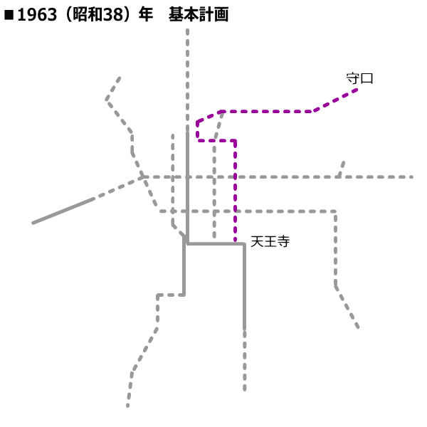 大阪市高速度交通機関協議会で1925(大正14)年10月に高速鉄道計画を策定、1926(大正15)年3月27日の市議会で都市計画決定された当初の計画では、2号線(谷町線)は「東成区森小路南端〜善源寺町野江線〜北区天神橋筋6丁目新京阪電車終点南側〜阪神電鉄北大阪線〜国有鉄道東海道線大阪駅〜都市計画路線北野線〜北区扇橋南詰〜東区天神橋南詰〜都市計画路線松屋町筋〜国有鉄道関西線天王寺駅南側」の、全長13.7kmの路線として計画された。この当時の計画では、森小路から新京阪電鉄天神橋駅の東までは高架での計画であり、全線が第2期事業とされた。また、現在の谷町筋経由ではなく、少し西側の松屋町筋経由となっていた。 |