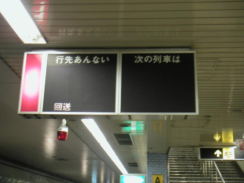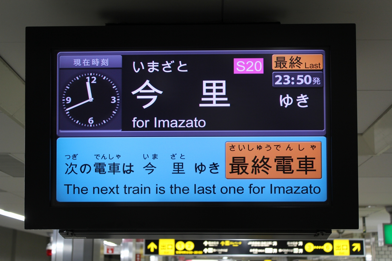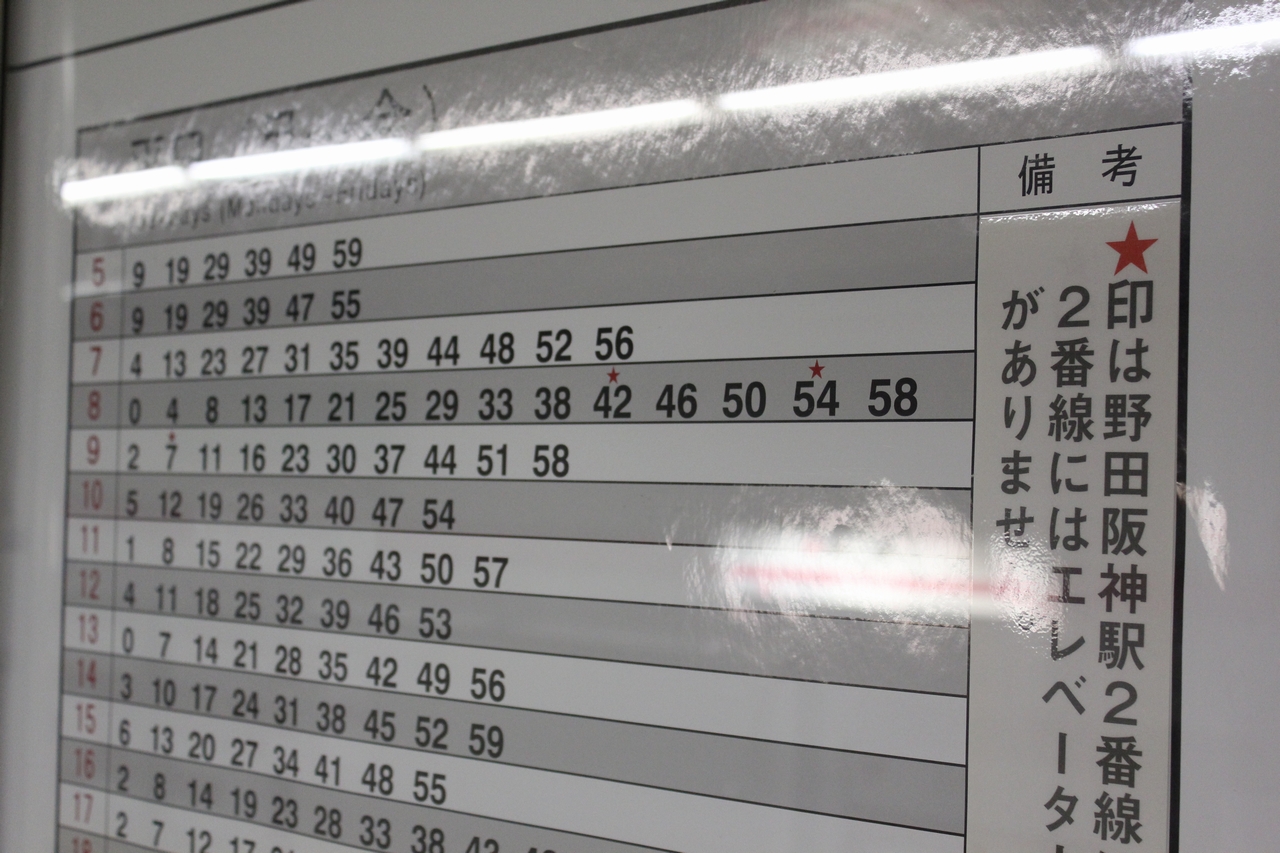 ●野田阪神2番線到着の列車 野田阪神駅は終着駅であるが相対式ホームとなっており、通常は1番線のみの使用となっている。しかし折返し回送になる列車に限り、1日数本2番線に到着する列車が存在する。野田阪神2番線にはエレベータが設置されていないため、旅客に2番線に到着することを知らせるため、時刻表に星印で、また車内放送でも案内されるため、容易に見分けがつく。 |