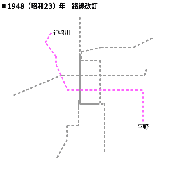 5号線(千日前線)の計画は、1948(昭和23)年6月18日に市議会で確定した路線改訂で設定された。東西の輸送力を増強するために4号線(中央線)だけであった東西路線を分割して2路線とした。千日前線は神崎川で阪急神戸線、塚本で国鉄東海道本線、野田で阪神本線と連絡し、これら国私鉄の乗客を直接都心部に運び、梅田の混雑緩和を図るとともに、国鉄関西本線・南海本線・南海高野線・近鉄奈良線・近鉄大阪線と連絡をする路線とされた。今里〜平野間は、4号線(中央線)の計画では森小路大和川線(今里筋)を経由していたが、今回5号線(千日前線)では布施方面との連絡を考慮し、新庄大和川線(内環状線)経由に変更されている。区間は「東淀川区三津屋北通1丁目〜東住吉区平野泥堂町」で18.13kmの路線として計画された。 |