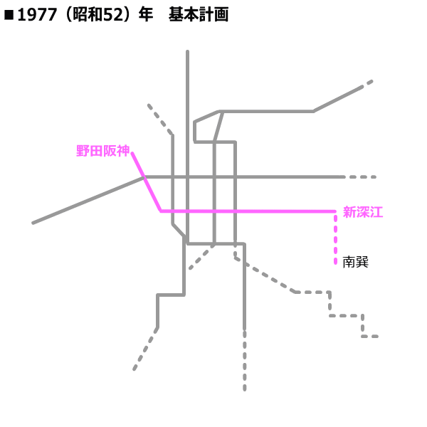 1963(昭和38)年3月29日の都市交通審議会答申第7号「大阪市およびその周辺における高速鉄道の整備増強に関する基本計画について」を受けて改訂された基本計画では、大阪市南東部の住宅団地としての発展がめざましく、今後輸送需要の増大に対応するため、千日前線は南側が平野から川辺まで延長された。1965(昭和40)年11月17日に野田阪神〜桜川間の建設に着手した。この区間は当初、難波付近の賑橋付近に難波仮駅を設け、四つ橋線と連絡させる予定であったが、国鉄湊町駅後退問題の見通しが立たず、国鉄との協議が長引いたのと賑橋付近の立退きが遅れたため、難波接続をあきらめて桜川までになった経緯がある。また野田阪神〜阿波座間は、当初の計画では尼崎堺線(新なにわ筋)を通る予定であったが、用地買収の目途が立っていなかったので、少し西側の市道大阪臨港線(現在の府道29号線)を通ることに変更された。玉川〜阿波座間は市道大阪臨港線に市電が走っており、さらに大阪市中央卸売市場に集まってくる自動車で毎日のように渋滞していたため、2層式隧道も考えられたが、開削工法で工事することは考えられなかった。また、堂島川・土佐堀川の河川横断はともに洪水河川であるうえに舟運の関係もあり、河川締切を行って潜函工法で工事することも困難であったため、シールド工法で建設されることになった。しかし、道路の幅員が狭いこと、ビルが近接していることなどから単線シールドでは技術上不可能であったため、中央線の谷町四丁目〜森ノ宮間に続く2例目の複線シールドが採用された。野田阪神駅は、阪神本線の高架を受替える必要があり、阪神電鉄と協議を重ねていたが、時間を要する見込みであったので、2両分のホームを建設し、野田阪神〜桜川間は1969(昭和44)年4月16日に開業した。 都心部の桜川〜谷町九丁目間では、千日前線に平行して阪神・近鉄が難波に乗り入れて相互直通運転をする計画があり、近鉄などと協議が重ねられた。この都心部での事業が難航していたため、谷町九丁目〜新深江間の建設を先行させることになった。谷町九丁目〜今里間は1965(昭和40)年7月20日に建設に着手した。この区間の都市計画街路泉尾今里線(千日前通)は当時22mしかなく、40mに拡張予定ではあったが、市電など路面交通が輻輳していて開削工法が困難であったため、シールド工法が採用された。今里〜新深江間は1965(昭和40)年12月25日に建設に着手した。城東運河(平野川分水路)の今里大橋下の施工法は検討の結果、大阪市初の凍結工法を採用することになった。しかし、完成まであと僅かとなった1968(昭和43)年9月7日に凍土が融解し、コンクリートの打ち終わっていなかった底床部から運河の水がトンネル内に流れ込み、大事故となった。当初谷町九丁目〜新深江間は、西側の野田阪神〜桜川間と同時開業する予定であったが、この事故により大幅に遅れ、谷町九丁目〜今里間は1969(昭和44)年7月25日に、今里〜新深江間は1969(昭和44)年9月10日にそれぞれ開業した。 |