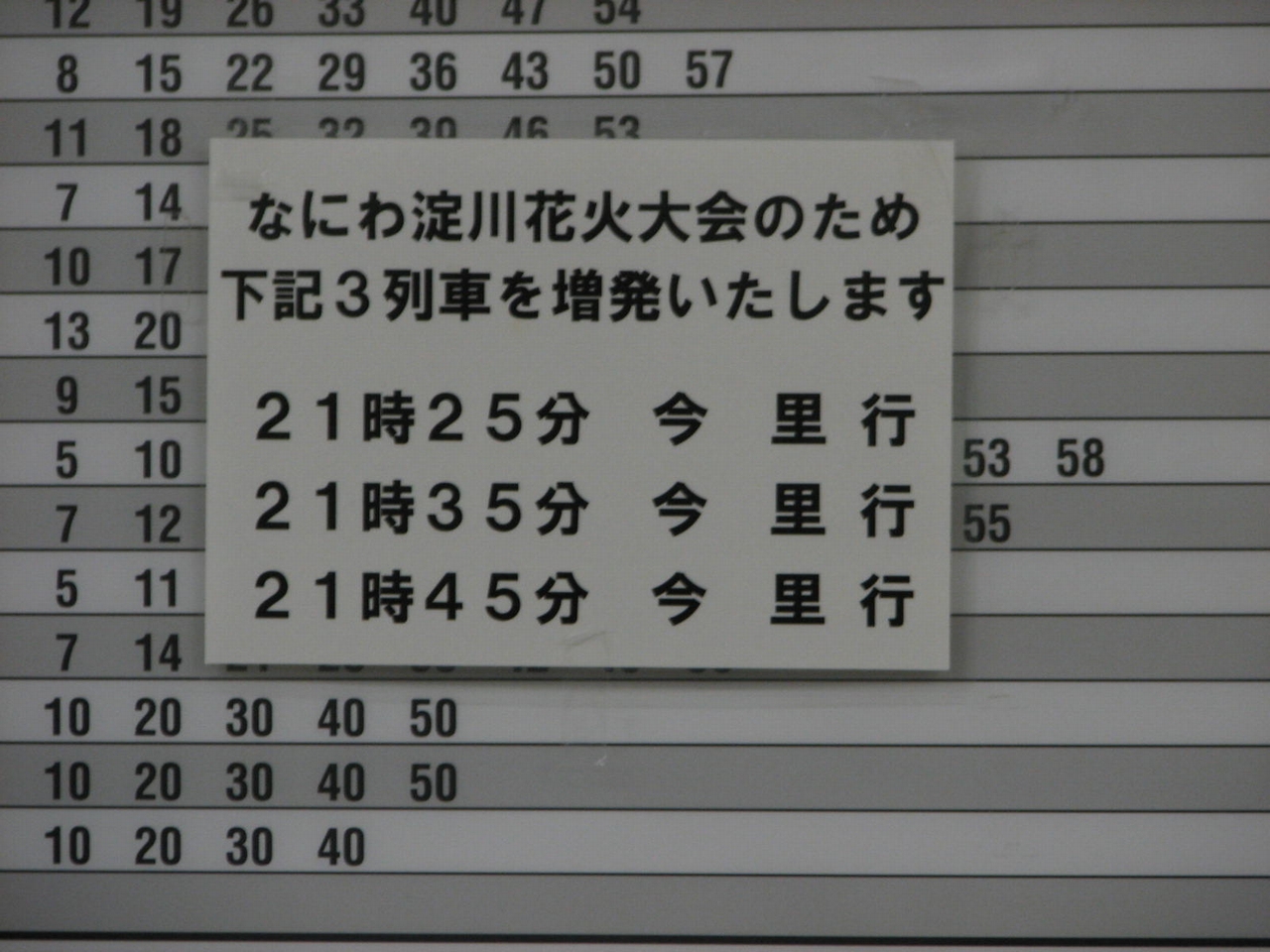 ●なにわ淀川花火臨 2006(平成18)年から、なにわ淀川花火開催に伴い臨時列車を運行している。2006(平成18)年と2007(平成19)年は、普段設定されていない今里行きが設定されたことから注目された。2008(平成20)年以降は南巽行きでの運転となっていたが、2015(平成27)年は今里行きが運転された。 |