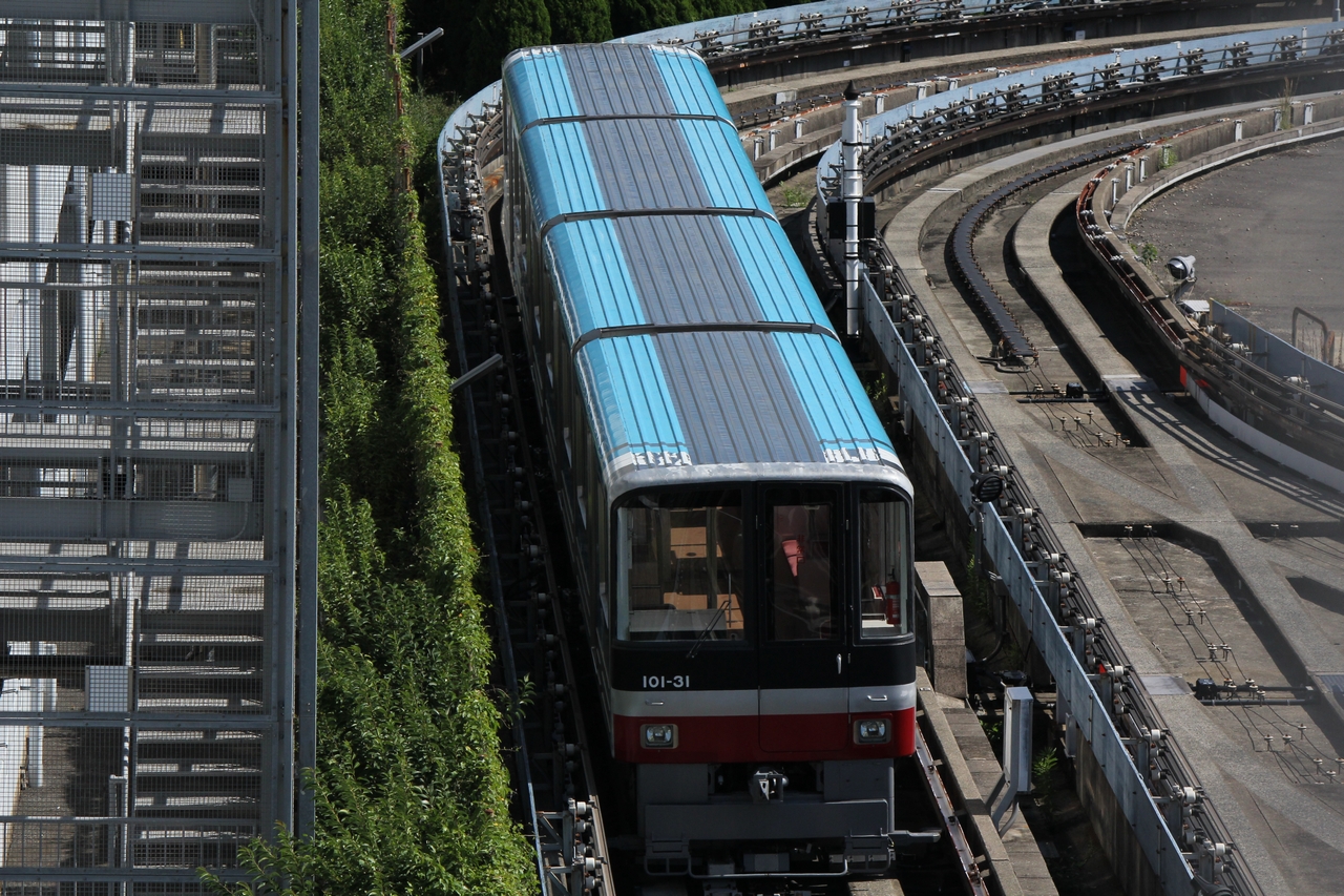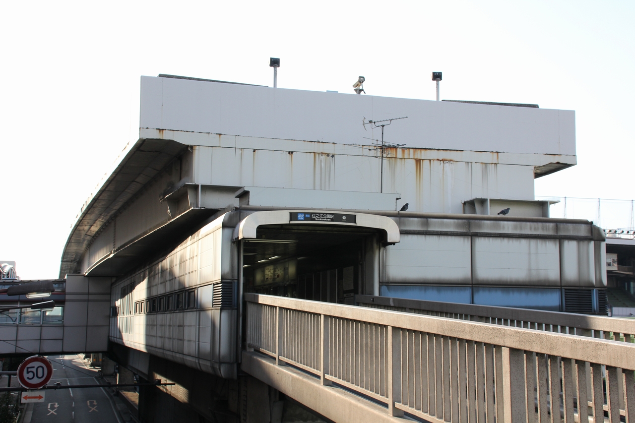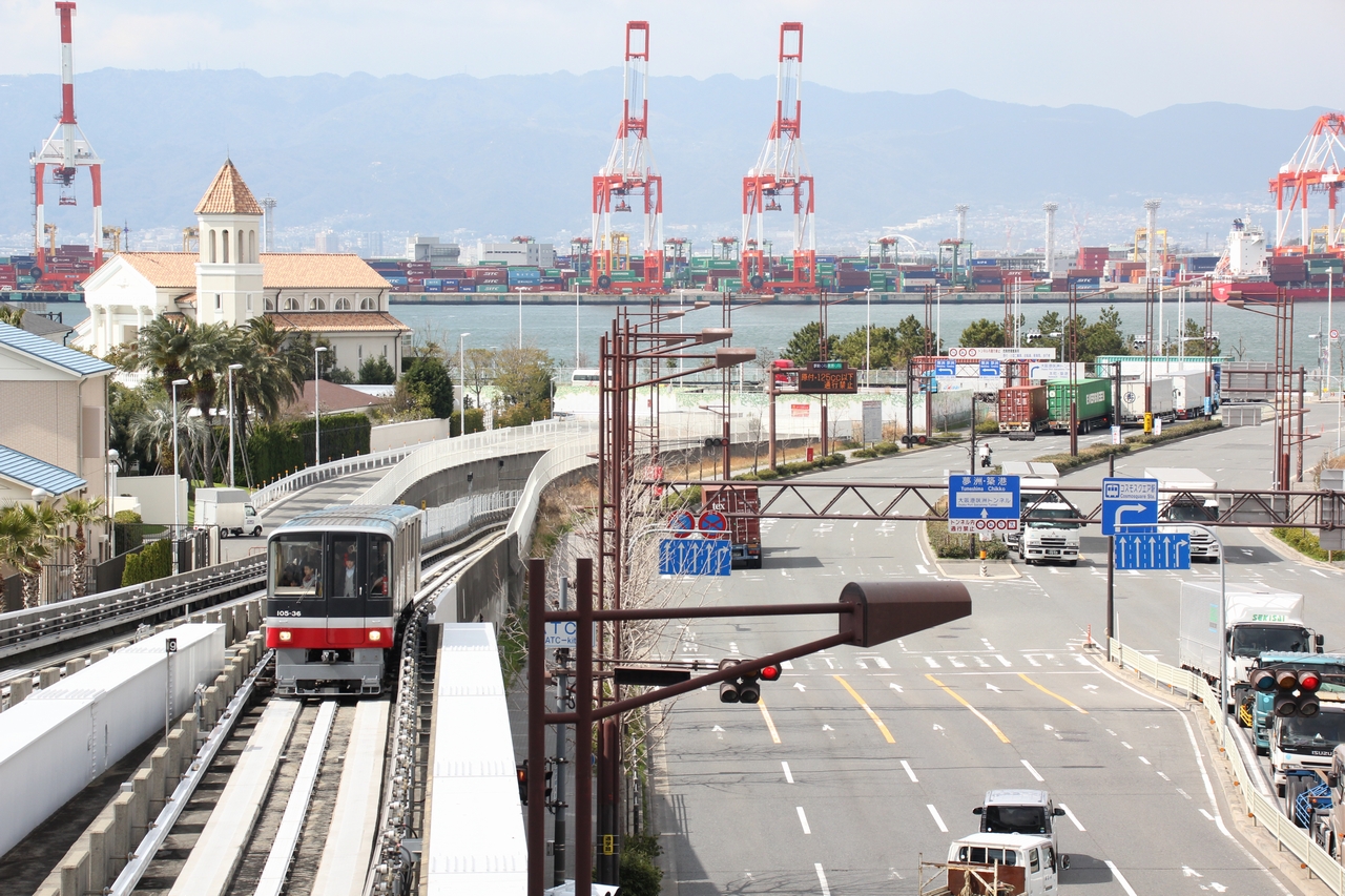 1973(昭和48)年、大阪南港ポートタウン住宅開発チームの報告書作成と同時に、大阪南港ポートタウンのマスタープランが作成され、港湾地域の中に居住区を設けるという新しい試みが軌道に乗り始めた。住居ができ、人口がはりつき、業務商業施設ができると、そこに人の動きが発生するのは当然のことである。そこで地域特性を踏まえた交通計画が必要となり、具体的な交通施設をテーマにした調査機関として、1974(昭和49)年に大阪南港新交通システムプロジェクトチームができた。そこで南港地区の交通システムとして、高架構造による地下鉄・モノレール・中量軌道新交通システム、高架道路によるバス専用道、平面道路によるバス専用レーンで比較・検討された。地下鉄の輸送能力からみて南港地区への導入は適さないとされ、またバス運行にすると、予想されていた需要量(1時間に約12,000人)を処理しようとすれば約45秒間隔の運行を行わなければならず、大型バスターミナル用地(8〜10バース)が少なくとも2か所必要となる。都市部にこれだけの用地を求めるのは困難であり、騒音・排気ガスなどの公害問題も発生することから、幹線交通システムとしてはそれぞれ見送られた。そこで注目されたのが中量軌道新交通システムであり、輸送能力が南港地区の交通需要量に適する、専用軌道を持った交通システムで安全、電気を使用してゴムタイヤで走行するので公害問題がそれほど発生しない、建設費が比較的安いとされ、その後の検討の末に南港地区の交通システムとして中量軌道新交通システムが導入されることとなった。将来無人運転をすることを想定して設備などが設計され、全区間高架構造、プラットホームは全囲をガラススクリーンで囲い、阪神高速道路との交差部には高速道路側から物が落下しないように防護柵を設置し、万一この防護柵を破って物が落下してきた場合に、これを検知できるよう転落検知線を設けるなどしている。 1981(昭和56)年3月16日に中ふ頭〜住之江公園間が開業、日本で神戸新交通に次ぐ2例目の新交通システムとして運行が開始された。開業当初は無人運転の前例がなかったので、無人運転システムへの理解・信頼を得られるまでは乗務員を添乗させ、監視の上で運行していた。その後1991(平成3)年10月20日からは無人運転が開始されている。しかし無人運転が開始されてから2年ほど経過した1993(平成5)年10月5日17時30分頃、住之江公園駅で列車が所定停止位置を50m以上行過ぎ、約30km/hで車止めに衝突するという「ニュートラム車止め衝突事故」が発生し、乗客215人が負傷した。この影響で1ヶ月半ほど運休し、代行バスを運行して対応した。1993(平成5)年11月19日に乗務員添乗の上で運行を再開し、2000(平成12)年2月19日に無人運転を再開している。また、2006(平成18)年4月14日に発生したゆりかもめ車輪脱落事故の影響を受け、事故後2日間は事故に対する警戒のために乗務員添乗の上で手動運転で運行された。2006(平成18)年4月17日に無人運転を再開している。 1997(平成9)年12月18日には、大阪港トランスポートシステムのニュートラムテクノポート線コスモスクエア〜中ふ頭間が開業し、相互直通運転を開始した。この区間は当時、南港への鉄道アクセスが住之江公園経由のニュートラムしか無いという事態を解消するために計画された路線であり、公共輸送ではなく利益誘導が主な目的であったために中央線の延伸という形では国からの補助を受けられなかったため、大阪港トランスポートシステムに事業を委ねたという経緯がある。当初は大阪港までニュートラムで建設される予定であったが、南港地区でのイベント開催時の輸送需要を考えた結果、普通鉄道での建設となった。しかし別料金で割高になり、利用者が低迷していたことから、2005(平成17)年7月1日からは大阪市の路線として一元的に運営されることになり、コスモスクエア〜中ふ頭間は南港ポートタウン線に編入された。ここで、南港ポートタウン線は現在の形となった。 |
