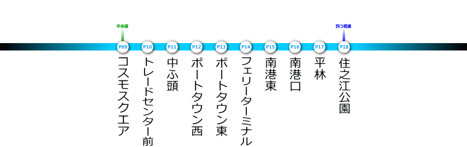 ●2013(平成25)年03月23日改正 【現行】 2013(平成23)年3月23日改正ダイヤでは、終発延長に伴い改正が行われた。終発後のコスモスクエア発中ふ頭行きの回送を旅客化した。運転間隔の変更はない。