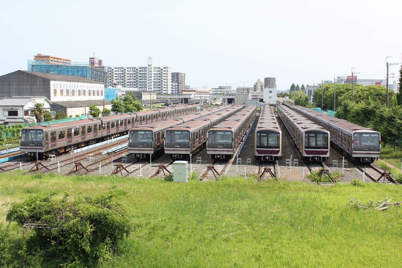 大日検車場は大阪府守口市にある検車場で、最寄り駅は谷町線の大日駅。配下に八尾車庫を置き、谷町線車両の月検査・列車検査を担当している。かつて谷町線の検車作業は、随道内に設けられた谷町検車場・天王寺検車区と中央線森之宮検車場を使用して行われていたが、1977(昭和52)年の谷町線守口延伸に合わせて初の谷町線専用の本格検車場として開設された。大日検車場〜守口間の隧道は、1983(昭和58)年の大日延伸より先行に建設されていた。 |